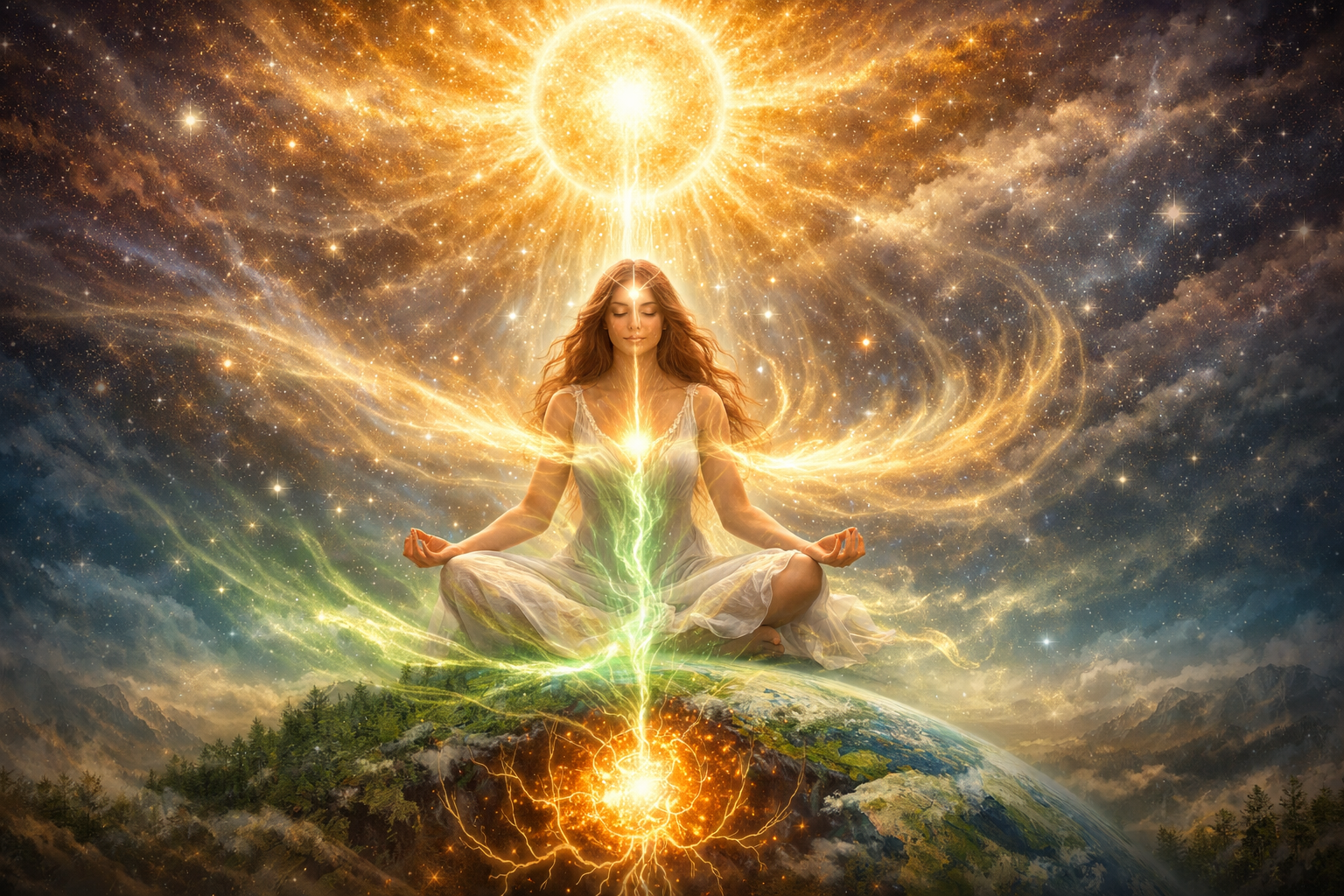 Tegelijkertijd maak je contact met Moeder Aarde. De dragende, voedende energie die je helpt om alles wat je ontvangt ook werkelijk te belichamen. De aarde zorgt voor verankering, veiligheid en integratie. Ze nodigt je uit om het licht niet alleen te ontvangen, maar het ook te léven, hier, in dit lichaam, in dit leven.